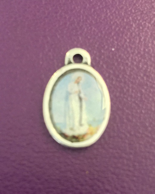 Pendant émaillé Ste Vierge, en zamac plaqué argent antique.