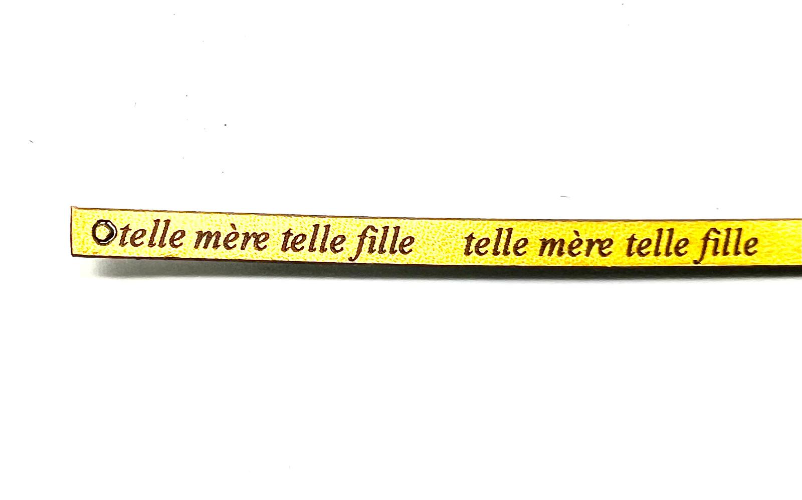 Cuir coupé et écrit au laser. "TELLE MÈRE TELLE FILLE"
