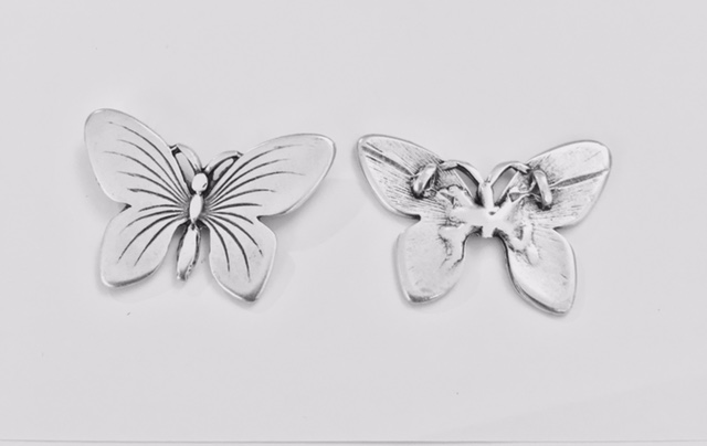 Papillon en intercalaire, avec 2  anneaux derrière, en zamac plaqué argent.