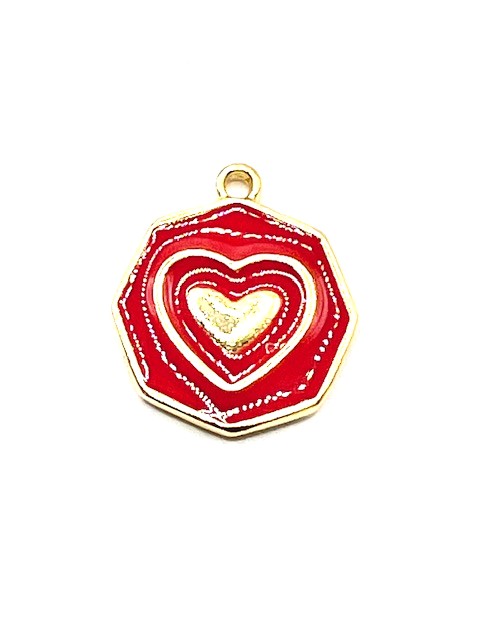 Pendant médaille hexagonale avec coeur émaillé, en laiton doré à l'or fin 24 carats.