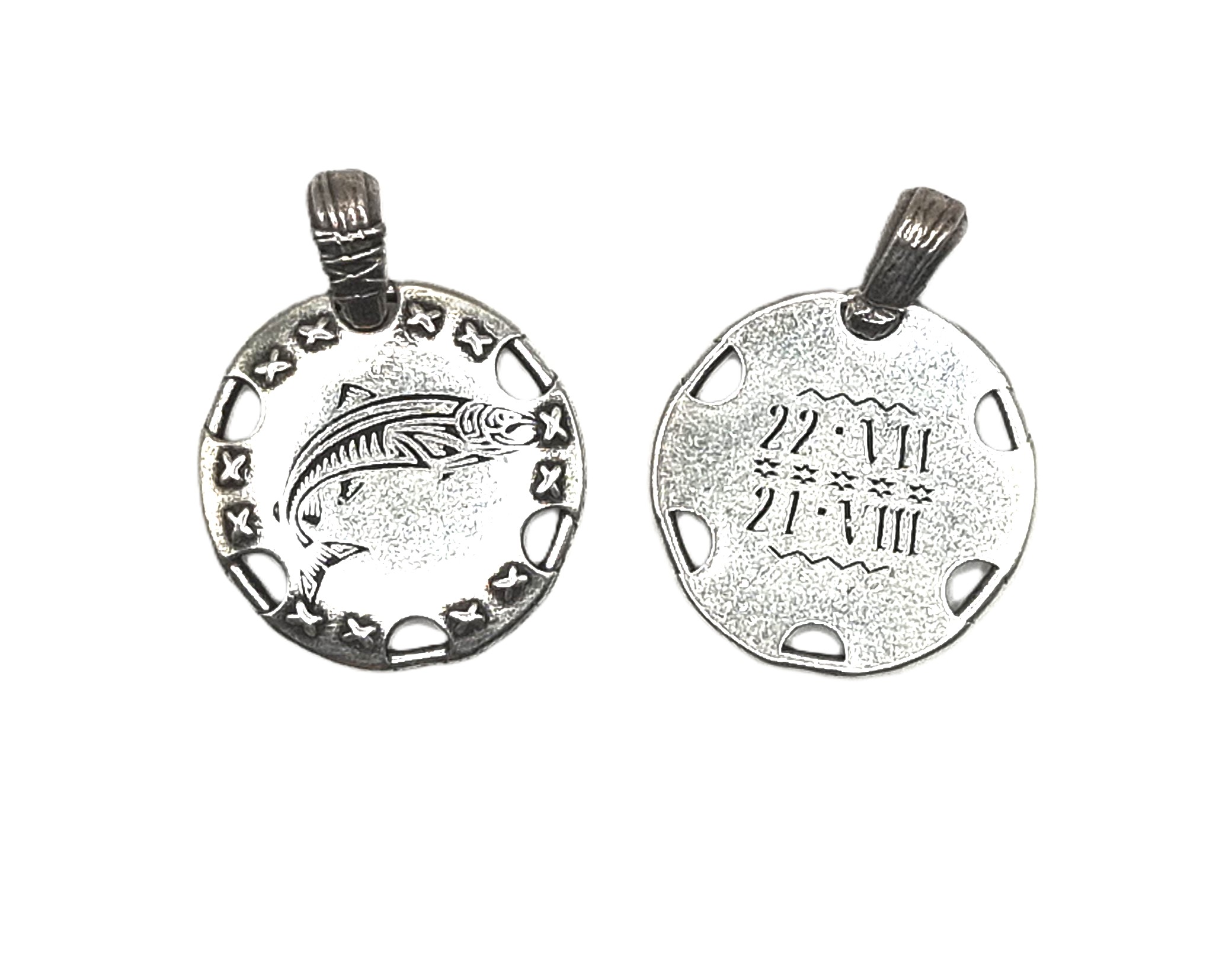 Signe du zodiaque amérindien, le saumon (22 juillet-21 août) en zamac plaqué argent antique.